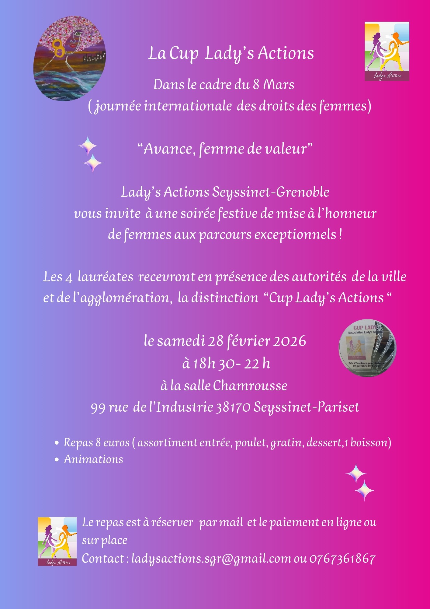 Samedi 28 février 2026 18h30-22hSalle Chamrouse, 99 rue de l'Industrie 38170 Seyssinet-Pariset Dans le cadre de la journée internationale des droits des femmes Lady's Actions vous invite à une soirée festive de mise à l'honneur de femmes aux parcours exceptionnels !Les 4 lauréates recevront, en présence des autorités de la ville et de l'agglomération, la distinction "Cup Lady's Action" > Repas 8 euros - réserver par mail laydyactions.sgr@gmail.com ou 07 67 36 18 67> Animations