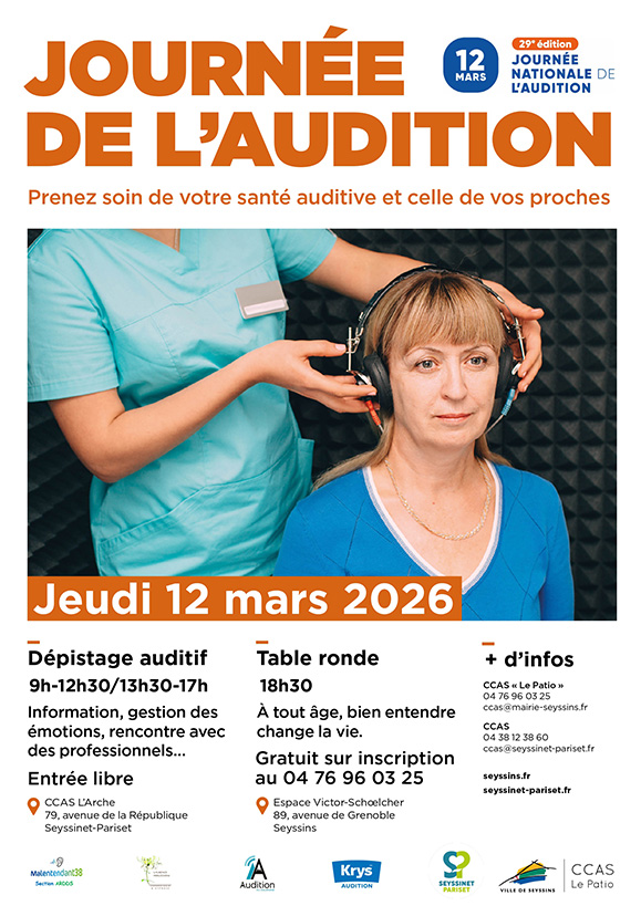Jeudi 12 mars 20269h-12h30 / 13h30-17hL’Arche, 79, av. de la république à Seyssinet-Pariset Prenez soin de votre santé auditive et celle de vos proches.Information, gestion des émotions, renconre avec des professionnels… Entrée libre+ d'infos : 04 38 12 38 60